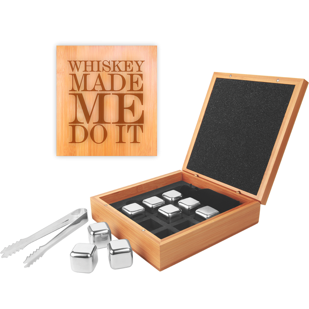 Indulge in a chilled beverage without compromising flavor with this stainless steel whiskey stone set. Nine stones, tongs, and a velvet bag are enclosed in a luxurious bamboo case. Keep them in the freezer for an ice-cold drink that's sure to impress. Personalize the top with a laser engraving.