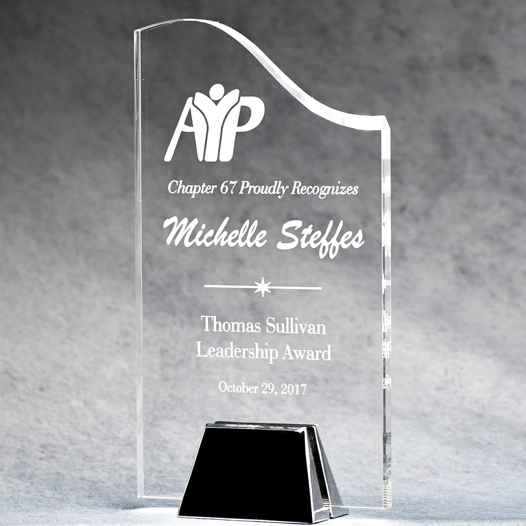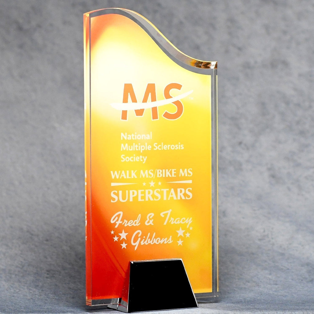 Hand-crafted, wave-cut acrylic is cradled in a solid silver-finished chrome base. Our creative team will work with you to get your text and logo printed in full high definition print. Let your creative ideas flow! This acrylic is perfect to highlight Distinction and Appreciation Awards.