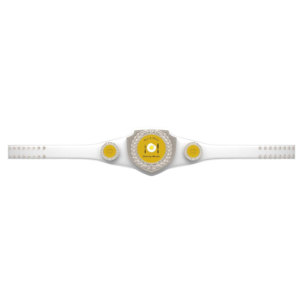 Our very popular Adult Championship belt is 52 inches long and made of vegan leather. Boasting 3 imprint areas measuring 8" x 7" on the front and 3" on each side, this championship belt is sure to make an impact in a big way. Available in Black or White, this awards comes if a velvet presentation pouch.