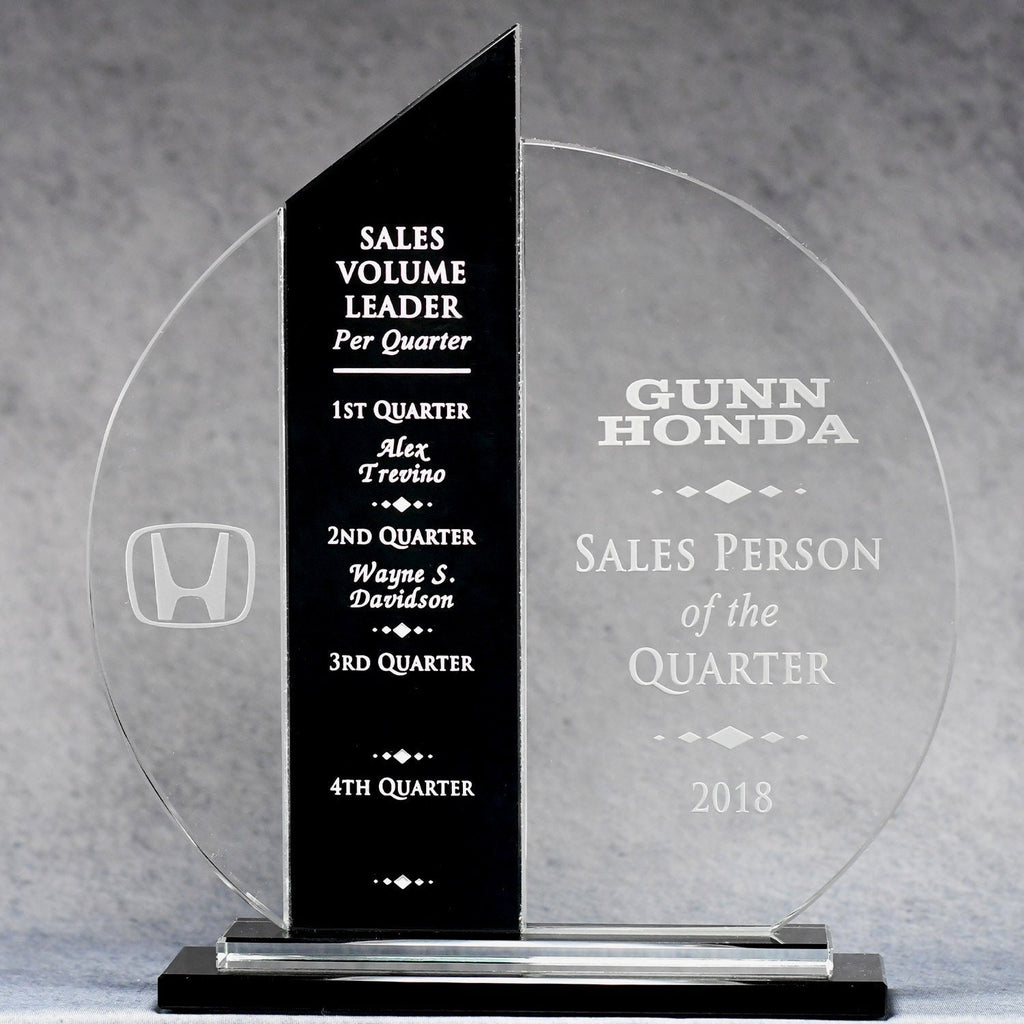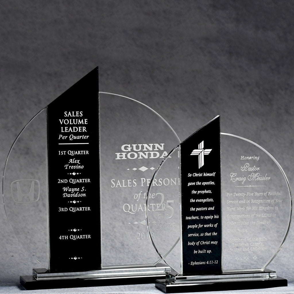 Beautifully beveled optic crystal is set atop a rich, ebony, optic base with a stripe of ebony crystal dividing the clear crystal disc as it demands to be noticed. Deep back and front etching gives this stunning piece depth and dimension.