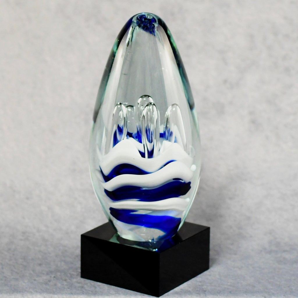 With beautiful contrasting colors of blue and white and available in two sizes, this modern egg-shaped art glass will be proudly received by any recipient! This unique colorful glass is attached to a black marble base. All of our art glass is hand-made to ensure that no two pieces are identical. Every award is a true "one of a kind" and bound to impress!