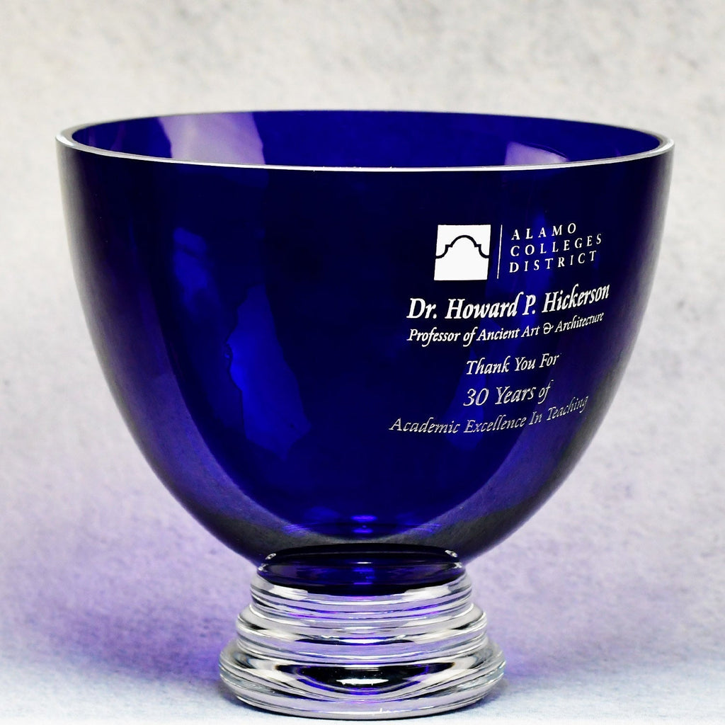 Cobalt Crystal Bowl makes an impressive gift or award for many occasions. The addition of custom text and images defines a perfect and timeless recognition piece. Boost team productivity with this elegant token of appreciation. Include your logo and a simple message of gratitude for a retirement gift. The optional black ebony base can be added to this item to increase its visual impact!
