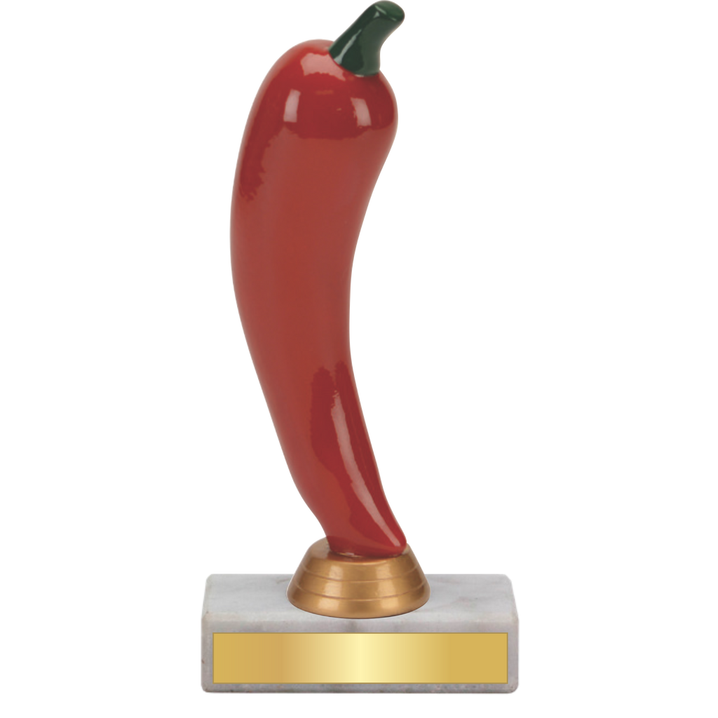 Spice up your event with our Chili Pepper Trophy! This fiery award stands at 6" tall and will add some heat to any presentation. Give recognition for the hottest dish with this red hot pepper. Bring the heat with our unconventional and playful trophy. (Don't forget the hot sauce!)
