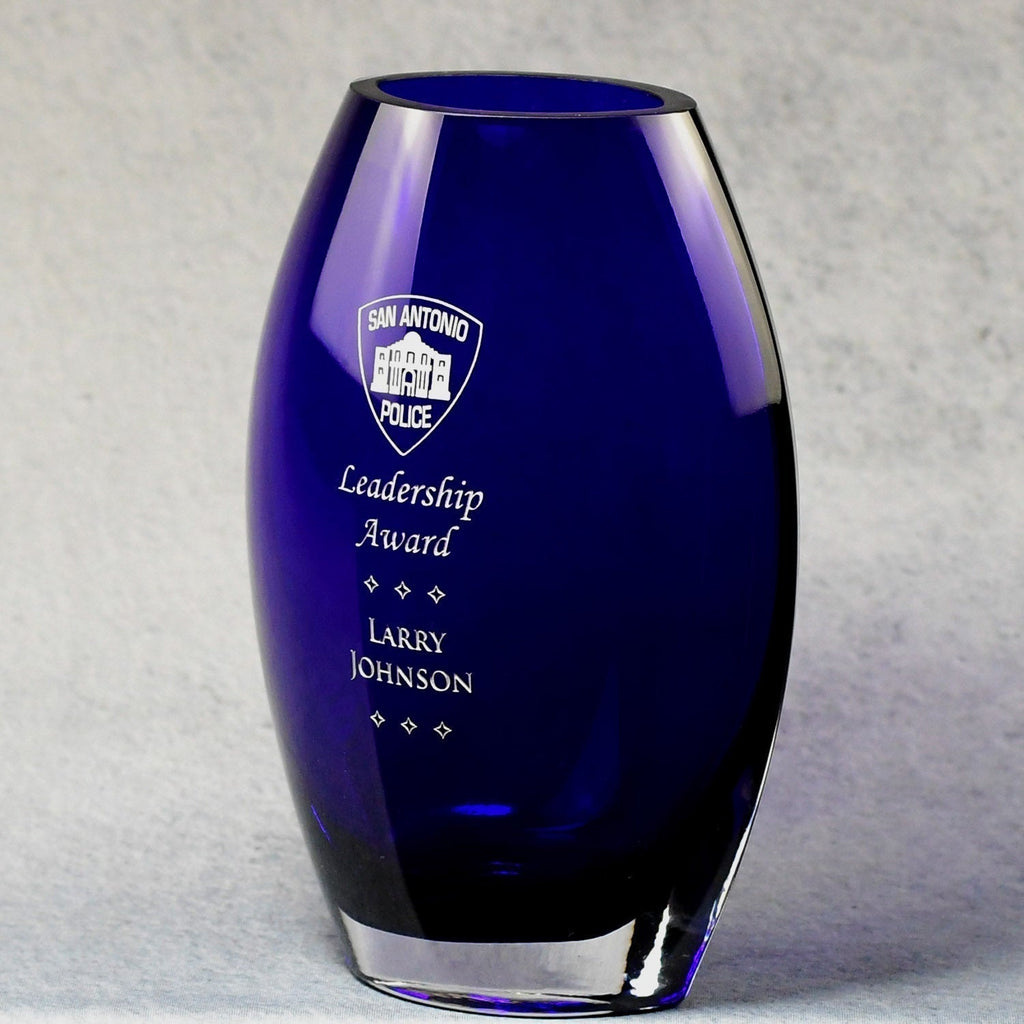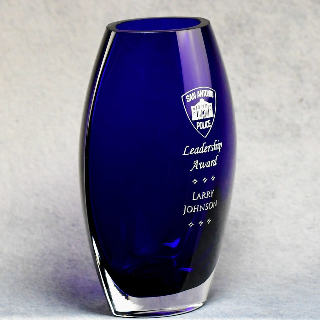 This cobalt crystal oval vase is available in 3 sizes and offers a large area to hold your logo and personalized text. Color filling in gold or silver is recommended to add striking contrast and draw attention to your perfectly crafted message. These vases are at home in many settings including office, church and home. Fill them with flowers for an extra special touch when making the presentation to your special recipient.