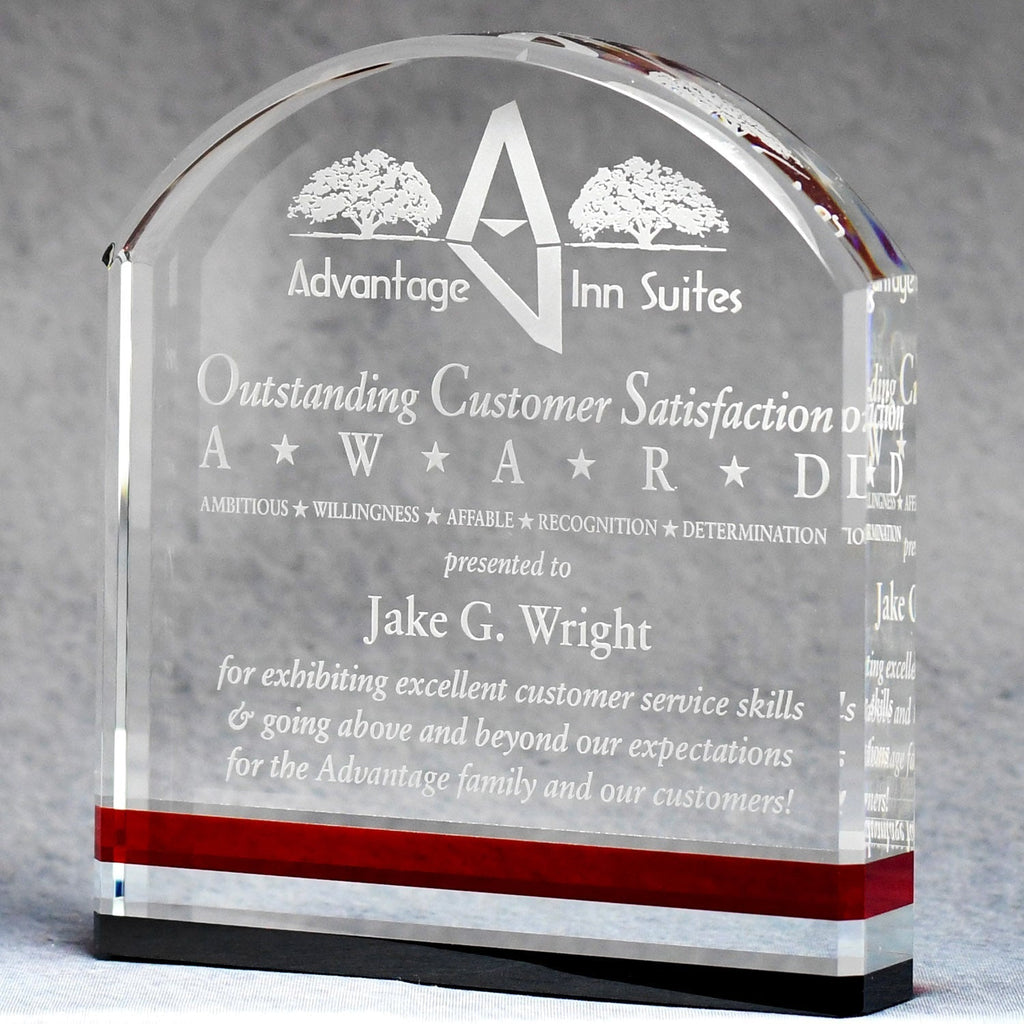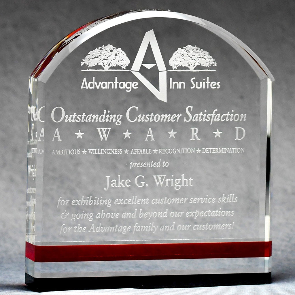 The Clear Crystal Arch Award acknowledges honor to a special someone in your life. Created from premium-quality optical crystal and deep etched with your custom text and/or logo. This award offers plenty of imprinting area and the design makes for a versatile piece for recognizing many different accomplishments.