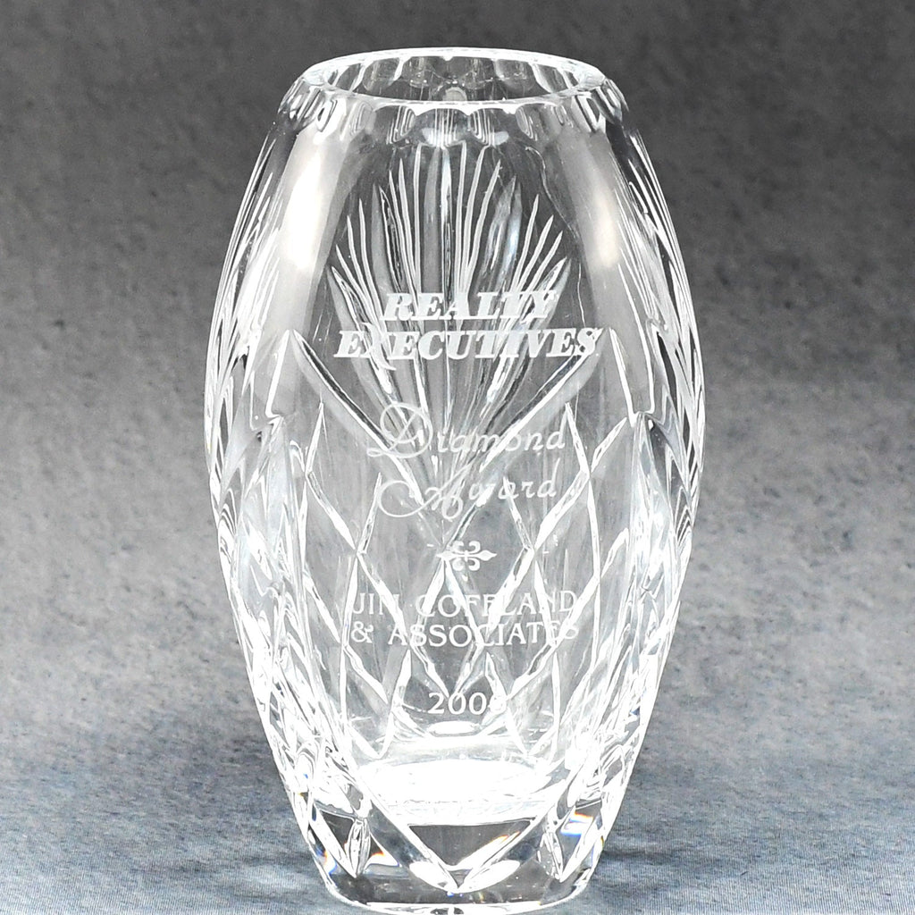 This Crystal Barrel Vase features deep cuts and bevels that create an eye-catching pattern. Add a logo or design to create a stunning recognition award or gift!