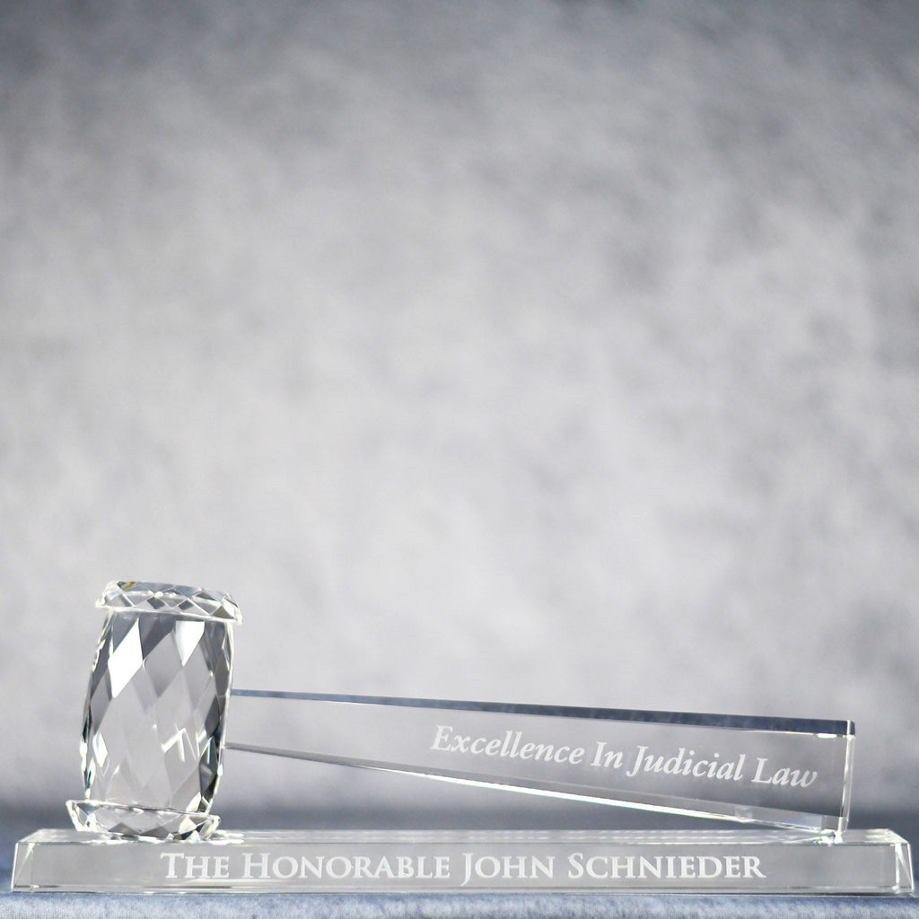 Although this beautiful crystal gavel can't call a meeting to order it will shine proudly. Both the gavel and the base are 10 inches long and have room for your personal message. You'll be judged as brilliant when you present this as an award or gift.