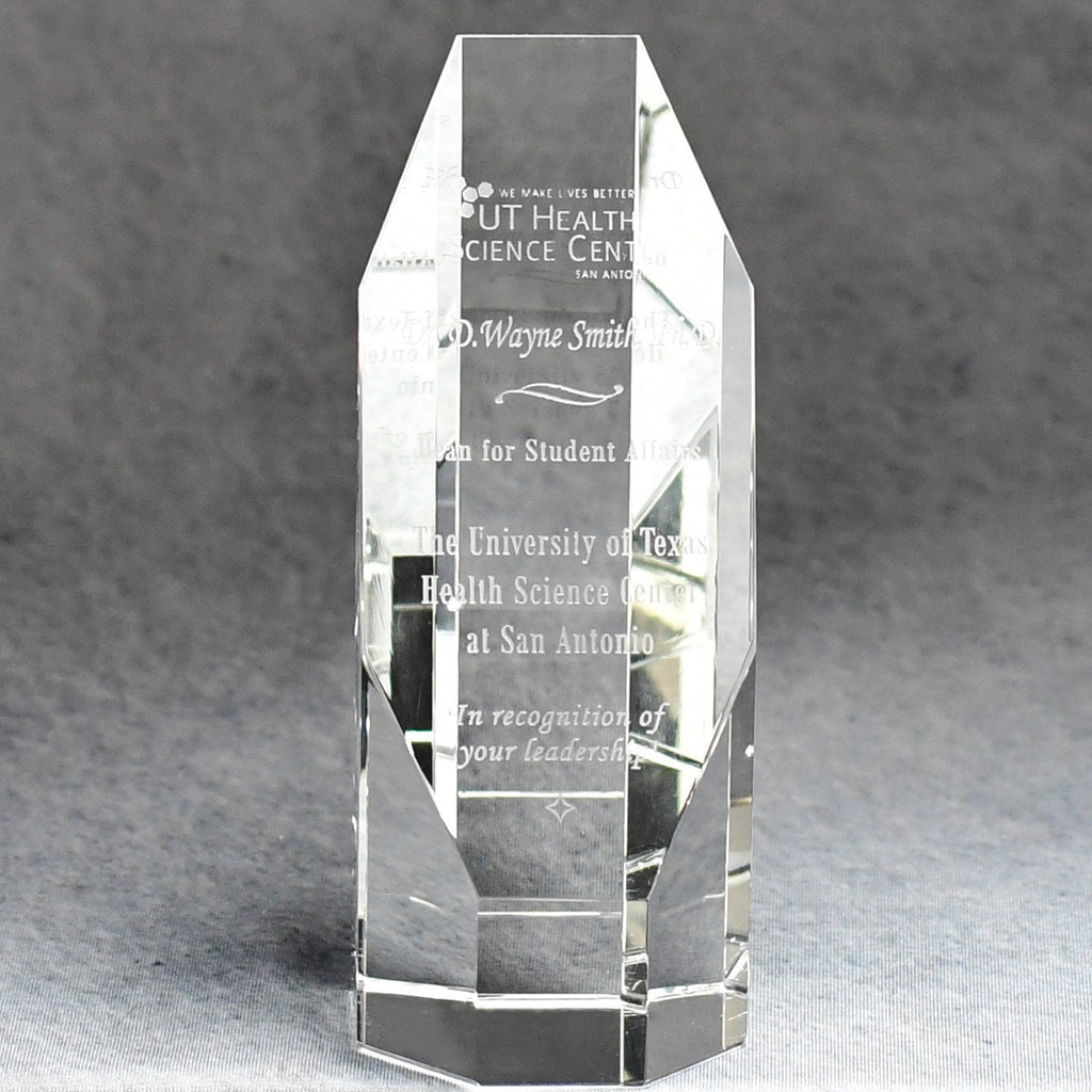 This Optic Crystal Octagon Tower with its sloping front is strikingly beautiful. Each item is precision machined and hand-finished to absolute perfection to accept your etched personalized logo and text.