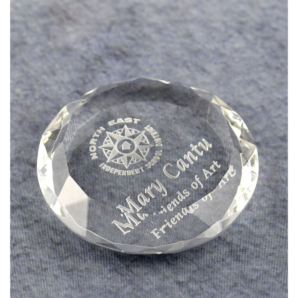 The traditional style of the Multi-Faceted Crystal Paperweight is a breath-taking choice for any individual recognition. The expertly cut, faceted edge gives the impression of a diamond jewel, while the round 3" shape leads the eye around and around the fascinating display of brilliance. Your personal sentiment is etched professionally for lasting recognition.