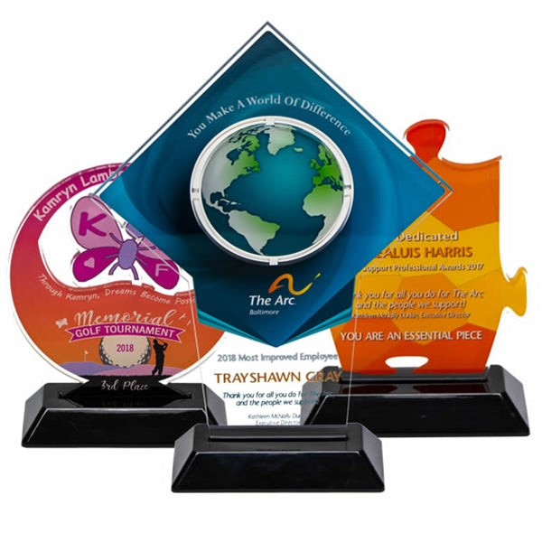 Our custom-shaped acrylic awards come in 4 sizes and are the perfect choice for any special event, whether it's for your business achievements, school accomplishments, or sports victories. These awards come in full color and will surely impress anyone who receives them. Don't settle for a generic award, choose our custom acrylic awards for a truly unique and memorable experience.