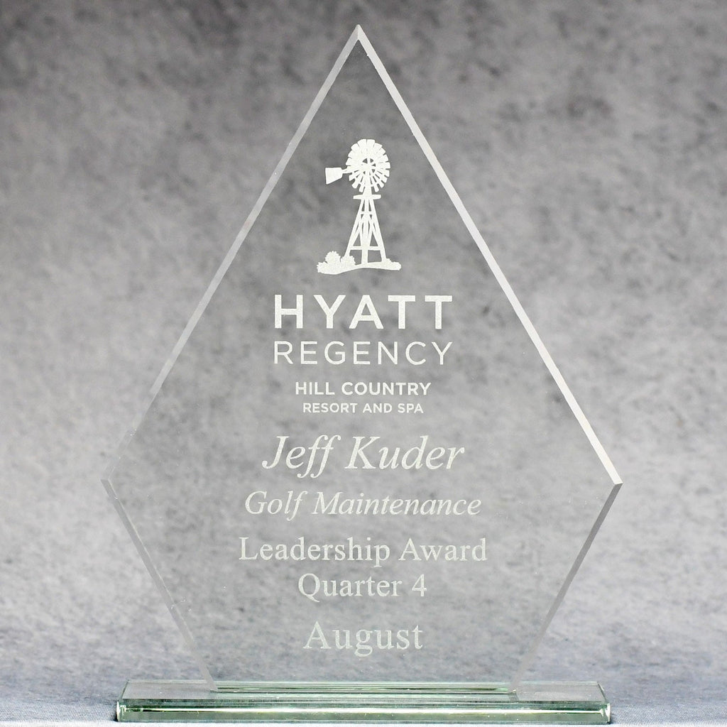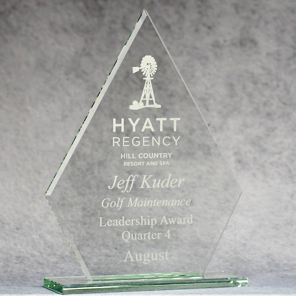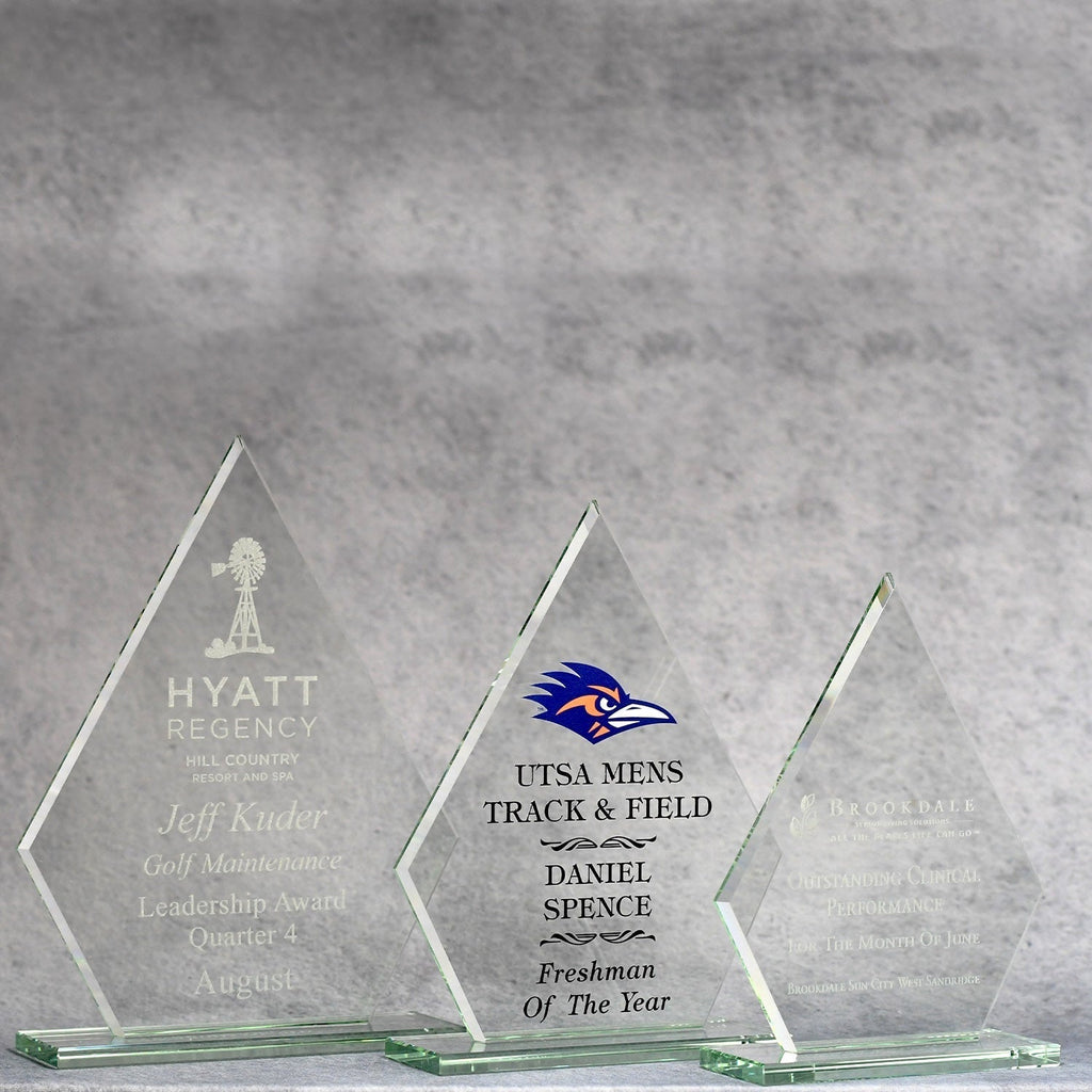 This beautiful, economical award is made of jade glass and comes on a jade glass base. Available in three sizes, it is perfect for a tiered recognition program. The diamond shape gives the appearance of sophistication. The imprint area is large enough for your personalized message and logo and the award can be imprinted digitally to enhance the visual impact. This quality product will look great on anyone's desk or bookshelf.