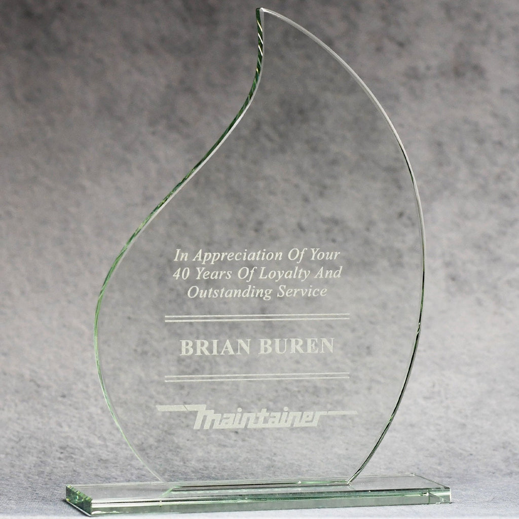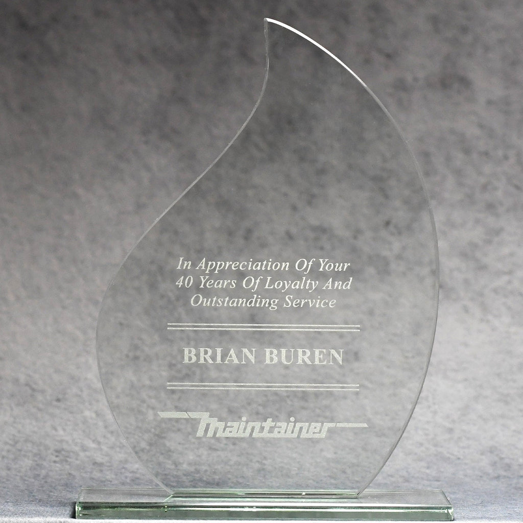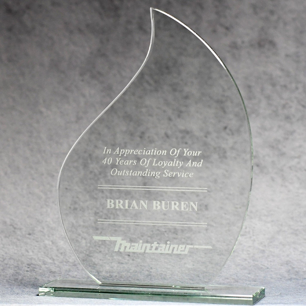 The flame award is made of jade glass and is HOT!! The finished product comes mounted on a matching base. Available in three sizes, it is perfect for tiered recognition programs. The large imprint surface allows you to include a logo, a quote, and a personal message reproduced with a variety of imprinting methods.