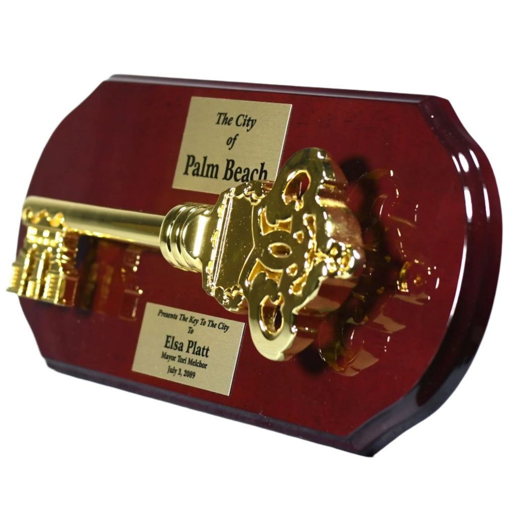 This handsome, solid rosewood plaque adorned with a heavy die-cast gold key will make an impressive presentation. Serves as a lasting acknowledgment of their commitment. The size is 7x16 inches and holds two plates. This plaque is the key to unlocking your success.