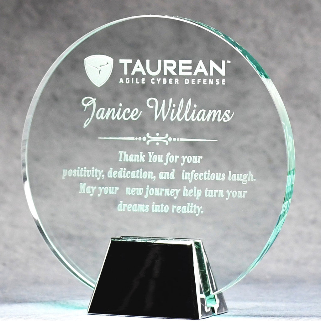 Stand out from the rest with a colorful design to recognize your top performers. Beautiful circular award on a chrome base. Available in 3 sizes.