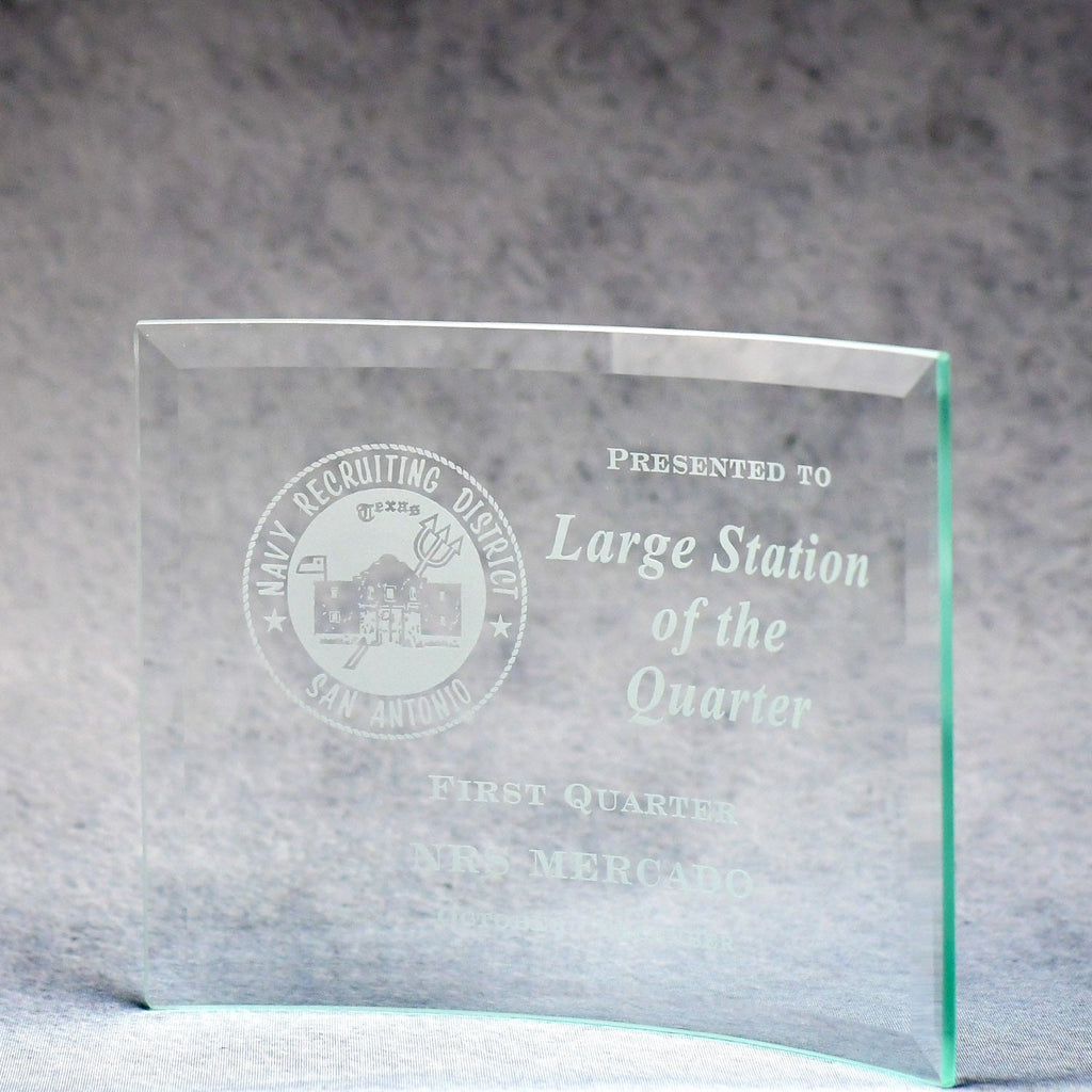 The Jade Glass Crescent is a curved landscape design that provides a panoramic backdrop for your presentation. Etched perfectly to honor the proud recipient. This would make a memorable award or gift!