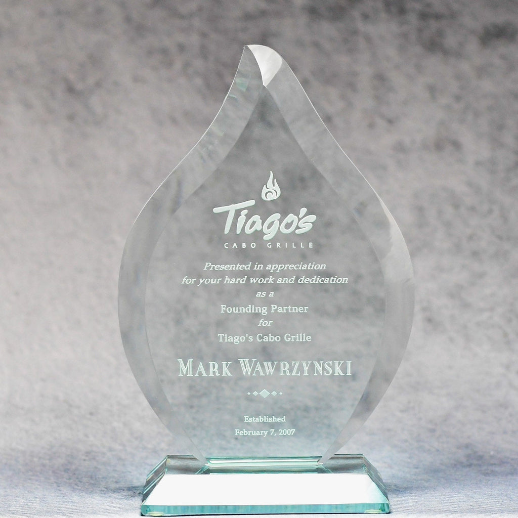 Fan the flames of accomplishment with this Jade Glass Fire Award. Etching adds depth to the hand-cut beveled edges and soft green highlights of each elegant jade crystal piece. This hefty 8.75" beauty would make a memorable award or gift!