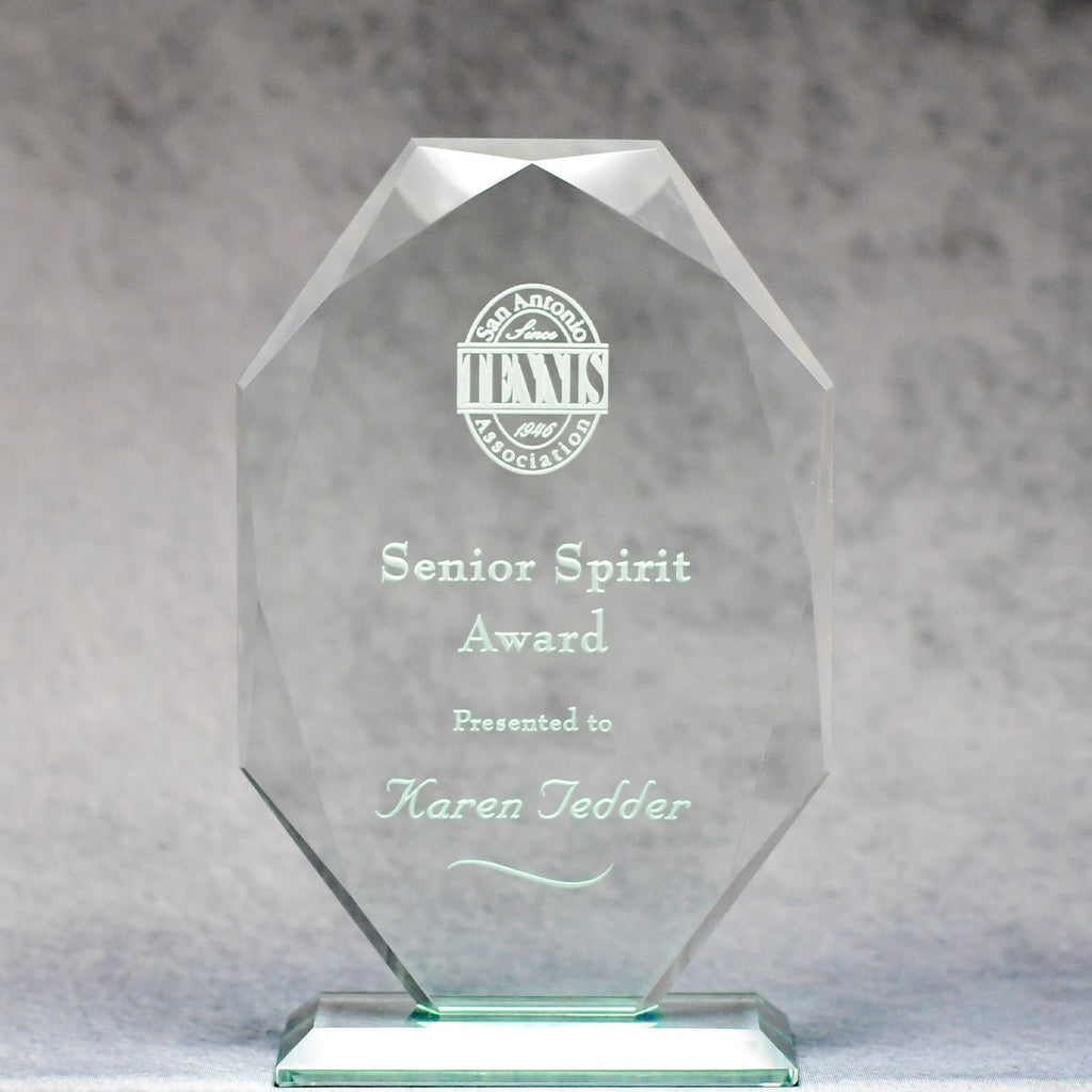 Our popular Jade Glass Multi-Faceted Elongated Octagon Award is presented handsomely on a matching beveled jade crystal base. Hand-cut beveled edges highlight each elegant piece and provide dimension and a beautiful reflection. This would make a memorable award or gift.