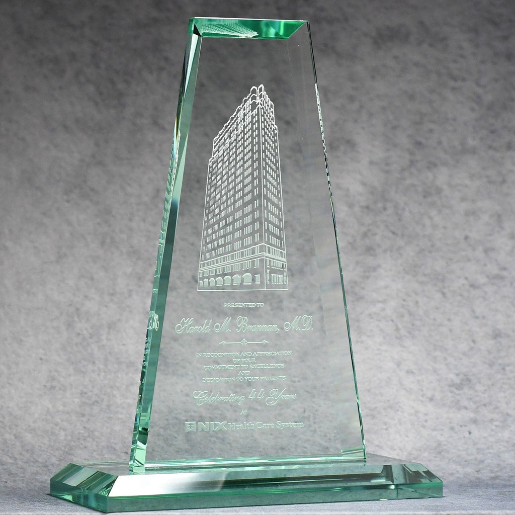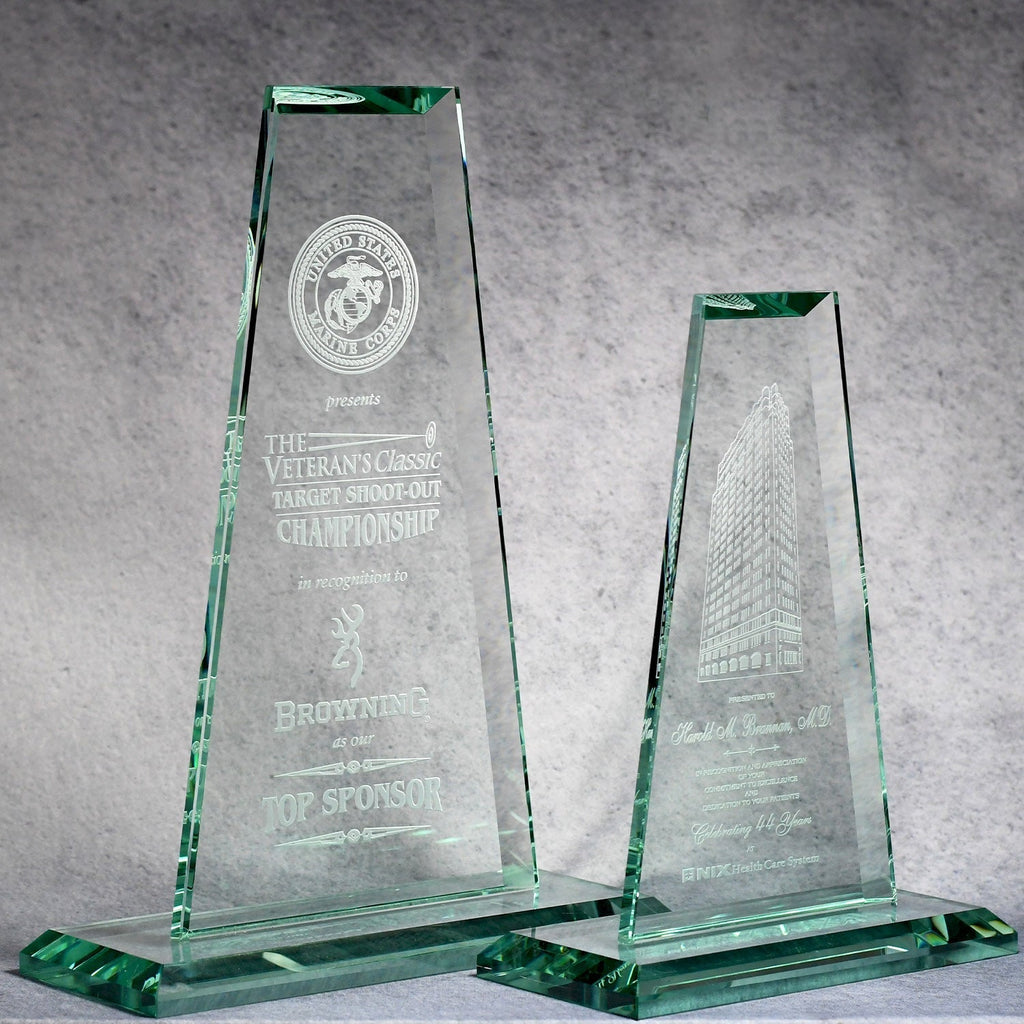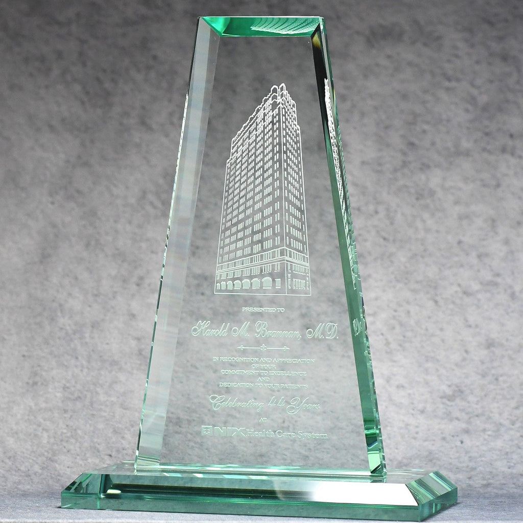 This Jade Crystal Tower is a striking symbol of corporate achievement. With a tint of jade green, this prestigious award has beautiful beveled edges and will be the center of attention at your next recognition ceremony.