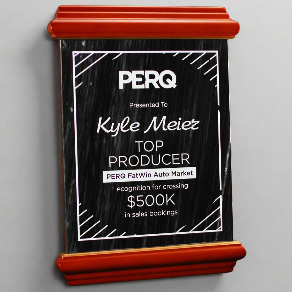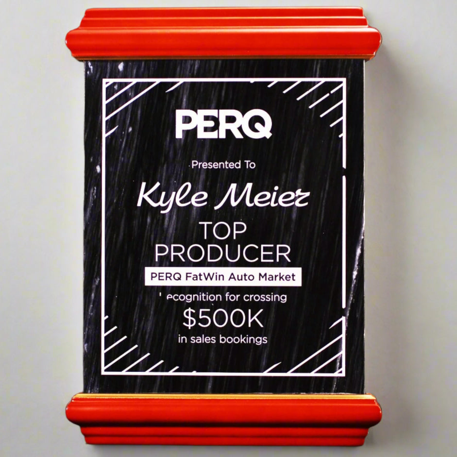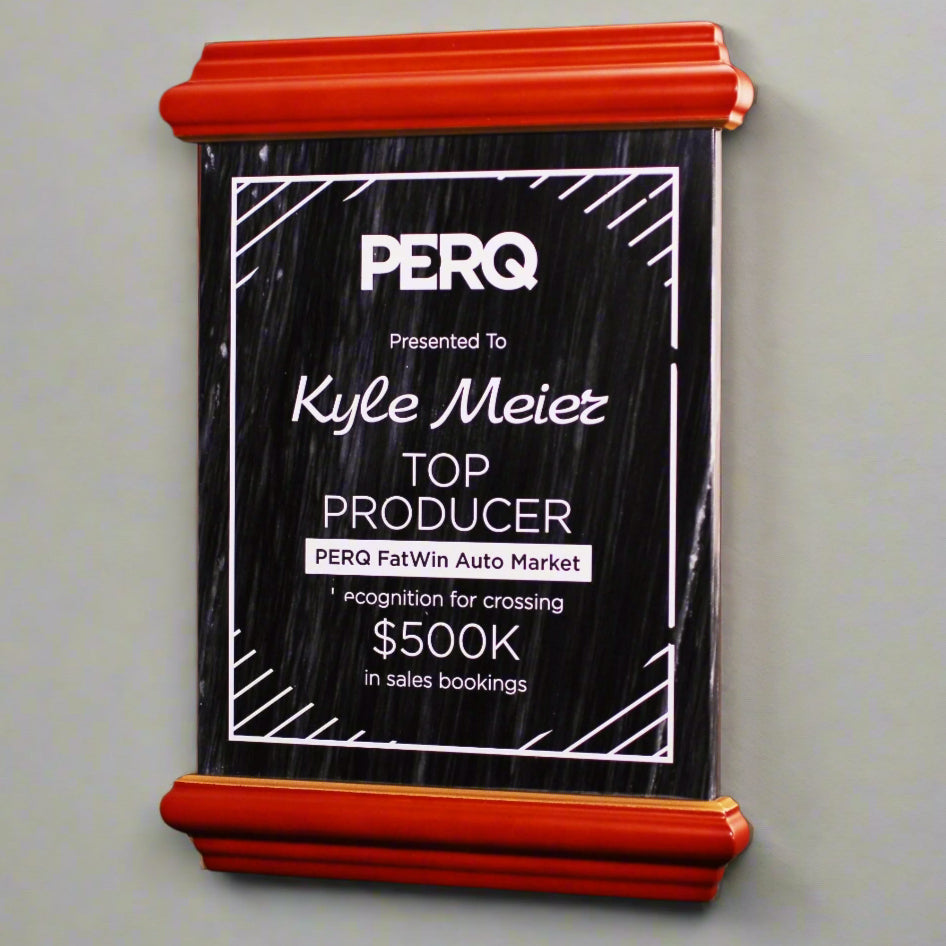 This sophisticated award features Mahogany Wood caps showcasing a rich Black Marble Panel for etching. With two available sizes, it is an innovative way to honor the Employee of the Month and Employee of the Year for your company. Add custom text to create the perfect presentation gift to recognize significant donations to an organization. Include your company logo to honor a lifetime of service. Let us help you bring your vision to life!