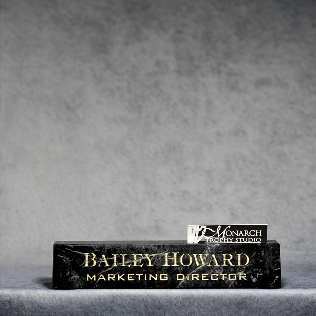 A variation on the standard desk wedge is this solid black marble name wedge. Carved in the top of the marble is a slot to hold business cards. The marble is sand-etched, and the lettering is color-filled with metallic gold paint to provide luxurious contrast.