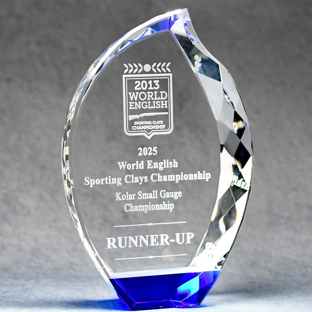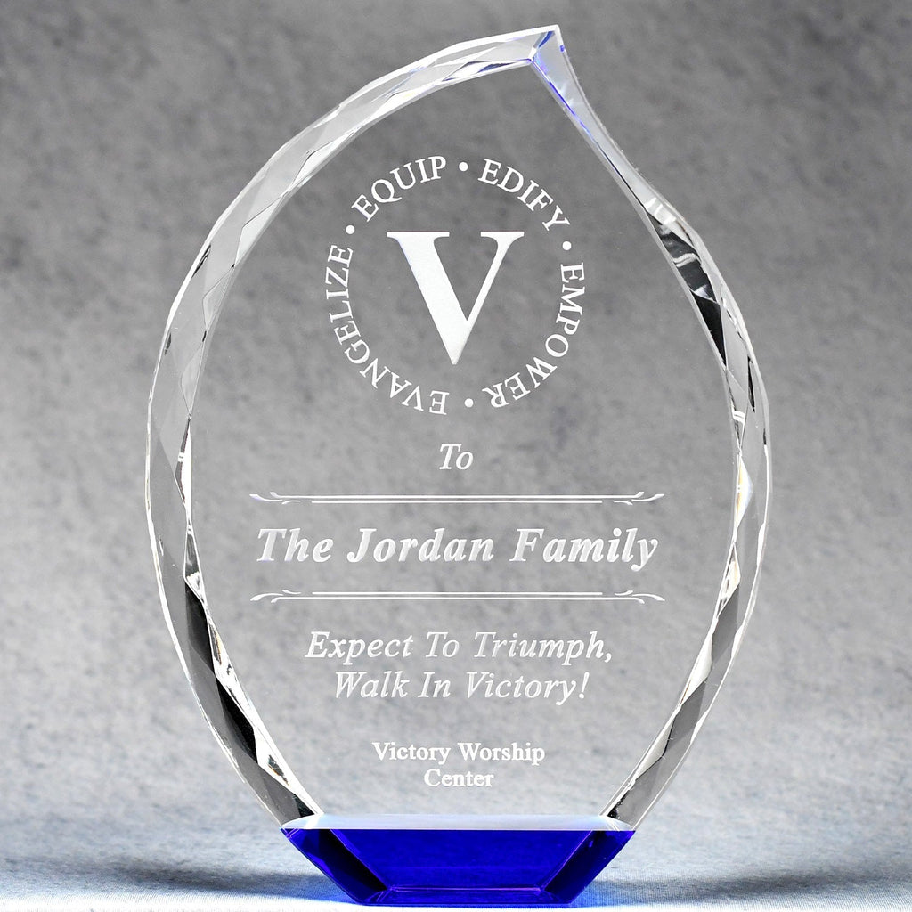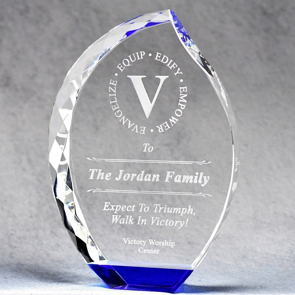 The complex bevels and cobalt blue accents combine to compose a noteworthy and sophisticated award. Weighing in at 7lbs., this crystal is an impressive 1.5 inches thick! This is truly a breathtaking piece!