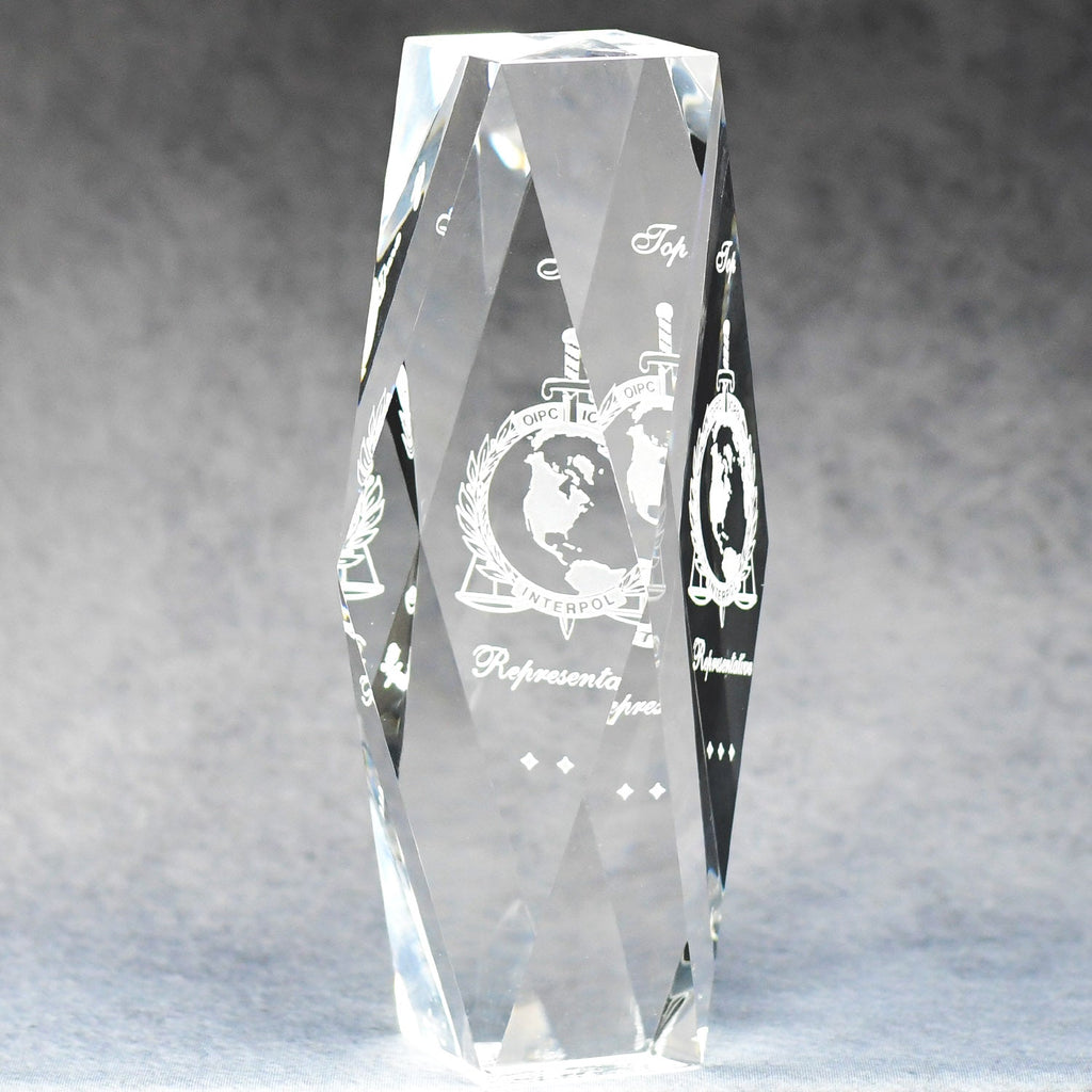 This prestigious tower is constructed from extra-thick, optical crystal and deep etched with your company logo and a congratulatory message. The multi-faceted bevels form a diamond-shaped area perfect for ANY award.