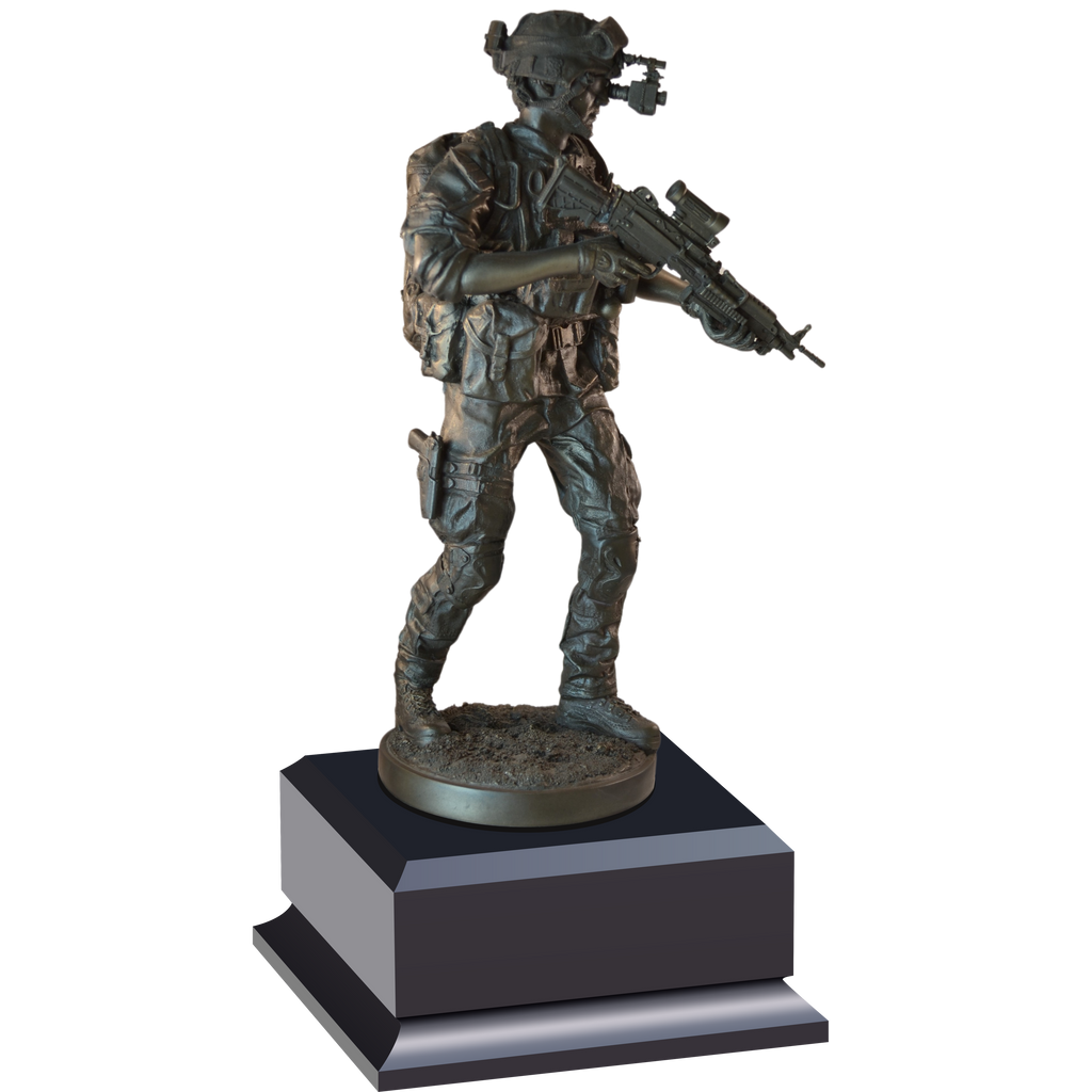 Show your military pride with the awe-inspiring Night Mission Soldier Statue. Crafted from antique resin, this 12.5" tall detailed statue makes a bold statement in any room.  This statue stands proudly on an ebony base with a gold plate for recognition of our oustanding service members.
