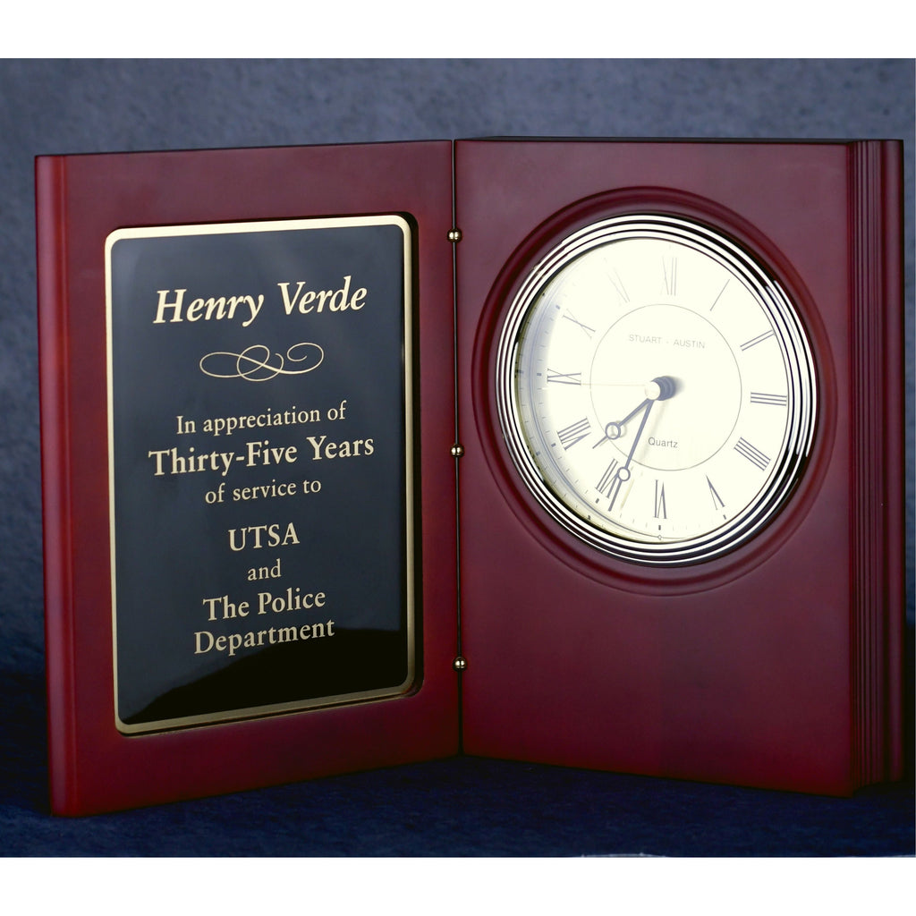 The Rosewood Book Clock is a hinged award or gift clock in presentation book form featuring a quality rosewood finish. The right side holds a beautiful quartz battery-operated clock with a gold bezel, two-tone dial with black Roman numerals, black hour and minute hands, and a gold seconds hand. The left side of the book design has a classic brass inlaid plate that can be laser engraved with your unique message, company logo, and the individual's name.