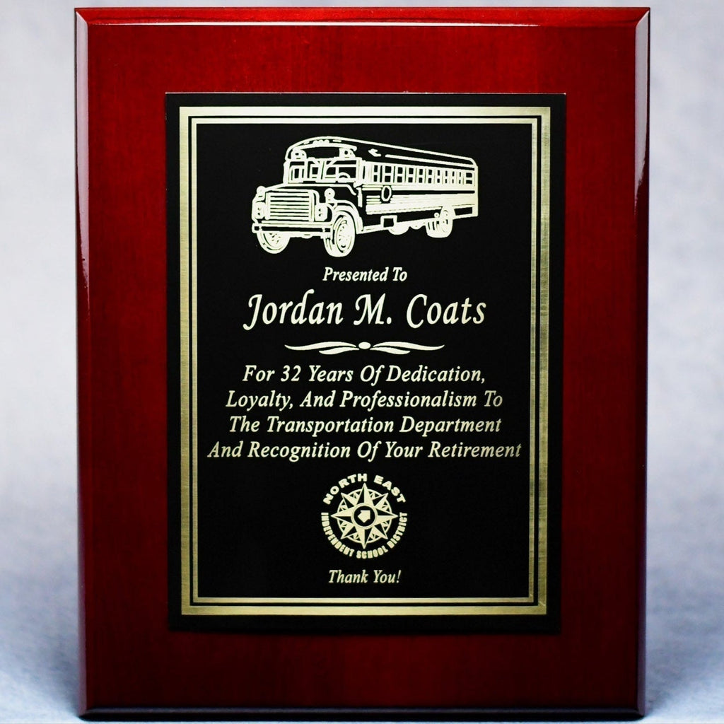 An elegant Rosewood Piano Finish Plaque with a lasered metal plate has a modern appearance that looks great in the office or lobby. A large imprint area can easily accommodate any logo and text.