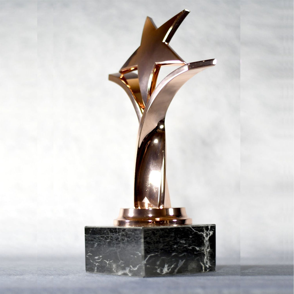 The Twisting Star on Black Marble Base stretches to new heights. The soaring cast metal figure conveys reaching for new goals and achieving them. The black marble base adds to the heft of the piece, communicating the weighty impact of accomplishments. Recognize your recipient for meaningful contributions and encourage others to likewise reach for the stars. Imprint your word of gratitude on a handsome metal plate attached to the base.